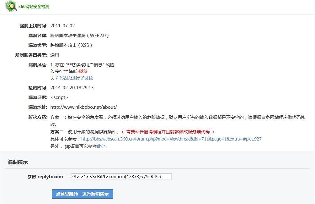 前些日子,收到 360 的提醒,说我的网站竟然高危,仅仅获得 2 分,速度打开,一看,满屏幕的跨站脚本攻击漏洞(WEB2.0),细细查看,愣了我半天。主要是说我的网站的 s 参数(搜索参数)和 replytocom 参数(回复参数)存在漏洞。可是,我不知道 360 得出的这个结果从何而来,我反复访问所谓的漏洞页面和正常页面进行检测,发现(也许是我眼花)毫无漏洞。而且那个搜索参数漏洞我之前才修复,并且进过检测确认没有已漏洞了,真不知道那个漏洞从何而来。